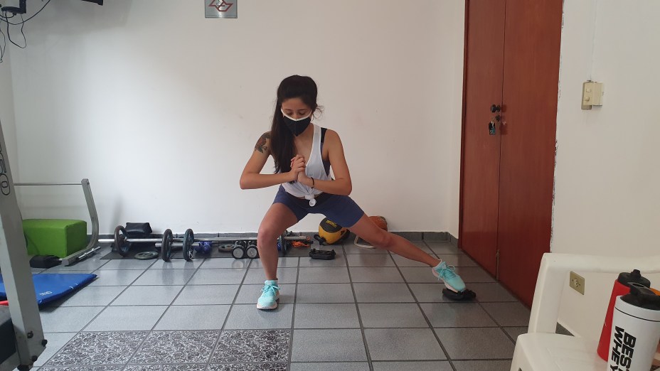 Em pé, coloque um dos pés na parte de rodinhas do acessório e deixe o outro no chão. Deslize o equipamento para trás, até os dois joelhos formarem ângulos de 90°. Retorne. Faça 3 séries de 15 repetições de cada lado.